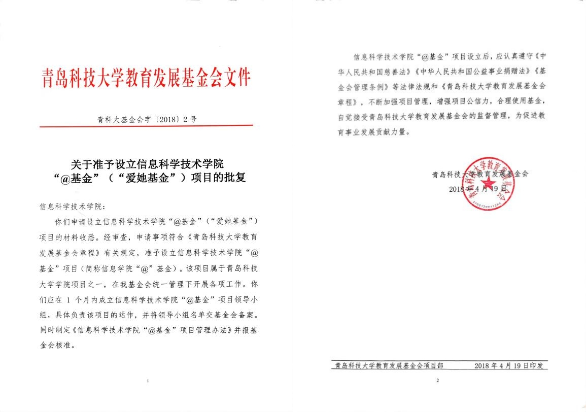 2018年4月19日,经学院申请提交“@基金”(“爱她基金”)项目材料,学校教育发展基金会同意设立太阳成集团tyc33455“@基金”(“爱她基金”)项目(简称信息学院“@”基金)。学院立即成立“@基金”项目领导小组,负责“@基金”项目的运行,并将领导小组名单提交学校基金会备案。同时制定《太阳成集团tyc33455“@基金”项目管理办法》并报学校基金会核准。