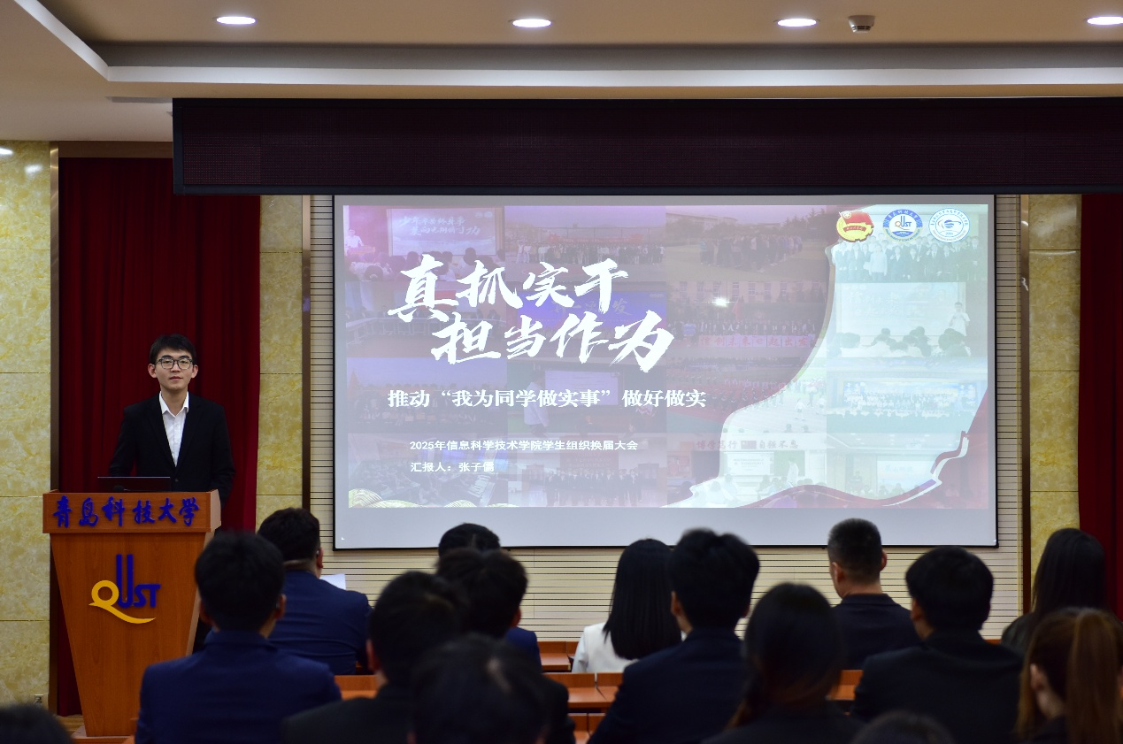 张子儒代表第二十一届学生会作工作汇报。他指出,过去一年,学生会始终高举中国特色社会主义伟大旗帜,以“全心全意为同学服务”为根本宗旨,通过开展公益活动传递校园温暖,打破专业壁垒促进学科融合,深耕文化美育提升学生素养,有效提升了学生会的师生认可度、学校贡献度与同学满意度。