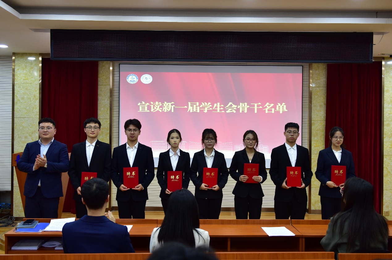 大会宣读新一届学生会、研究生会学生骨干名单,并为学生代表颁发聘书。