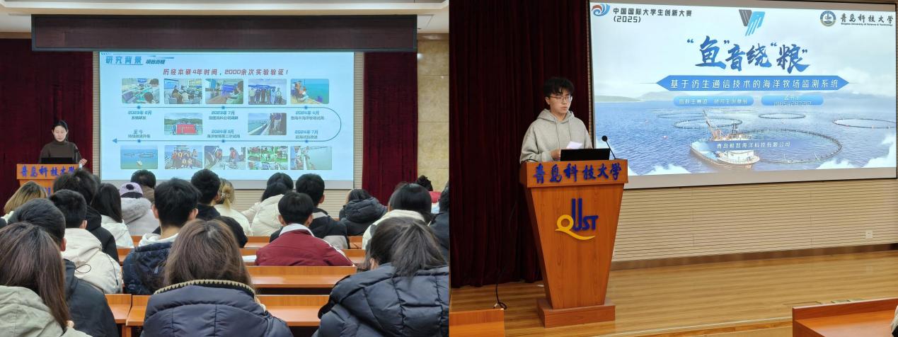 “鱼”音绕“粮”项目团队代表孙悦、孟书宇分享“挑战杯”获奖经验,从PPT逻辑架构、团队分工协作、支撑材料准备等方面进行分享,并结合自己参赛的亲身经历为大家讲述“避坑指南”。交流环节中,学生们围绕“队伍组建”“计划书撰写”等问题积极互动,现场氛围热烈。