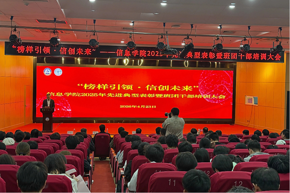 大会在庄严的国歌声中拉开帷幕。会上严增兴宣读了《信息学院关于表彰 2025 年度“榜样引领・信创未来”先进个人及集体的决定》。