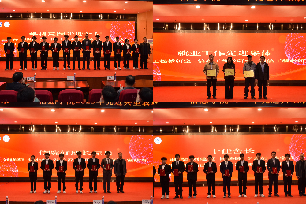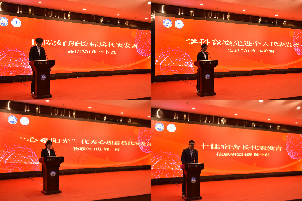信院好班长标兵代表谷长磊、学科竞赛先进个人代表杨静怡、优秀心理委员代表刘一诺、十佳宿舍长代表陈宇航作为获奖代表作典型发言和经验交流,结合自身成长经历分享学习工作心得,讲述奋斗故事,传递榜样力量,展现了信息学院学子昂扬向上、奋发有为的精神风貌。