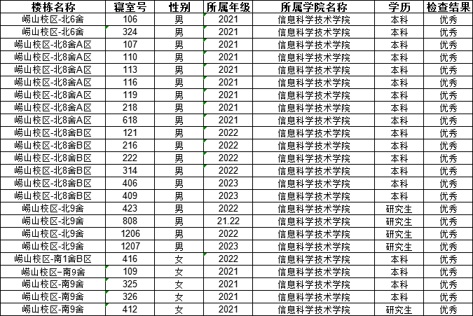 为进一步加强学生宿舍内务卫生和安全文明创建,强化学生宿舍安全意识,营造一个安全舒适、整洁优雅、文明和谐的宿舍环境。5月15日,学生工作处、后勤管理处及各学院开展了学生宿舍卫生安全秩序大检查。本次共抽查信息学院宿舍148间,24间宿舍获评“优秀宿舍,优秀率16.22%,合格宿舍124间,合格率83.78%,无不合格宿舍。优秀宿舍详见名单。
